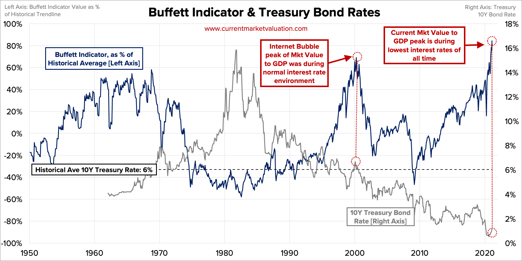 Argument som försvarar ett plötsligt P/E på 40+ (som vi enbart tidigare haft i bubblor) med att det beror på att räntorna är så låga, skulle jag översätta med den klassiska frasen: