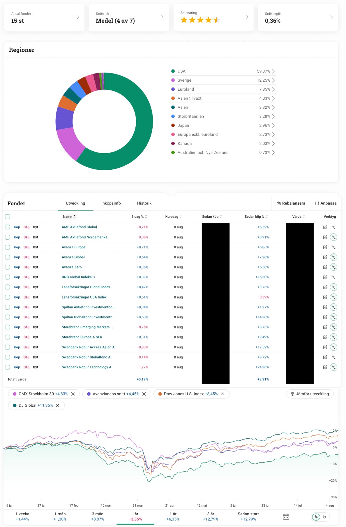 Ja, som flera påpekat så har min lista en behov av att “rensas upp”. Grundtanken vid köp av egentligen att försöka sprida risk, och med detta även valet av fonder (köpte då därmed flera olika). Nu i efterhand ska jag nog ta färre med låg avgift och köra på det. Det har inte varit min avsikt att vikta något land upp och ner mer än vad globalfonderna själva gör, även om så kan vara fallet för andra.