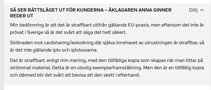 Att änvända och betala för illegal IPTV är inte straffbart.