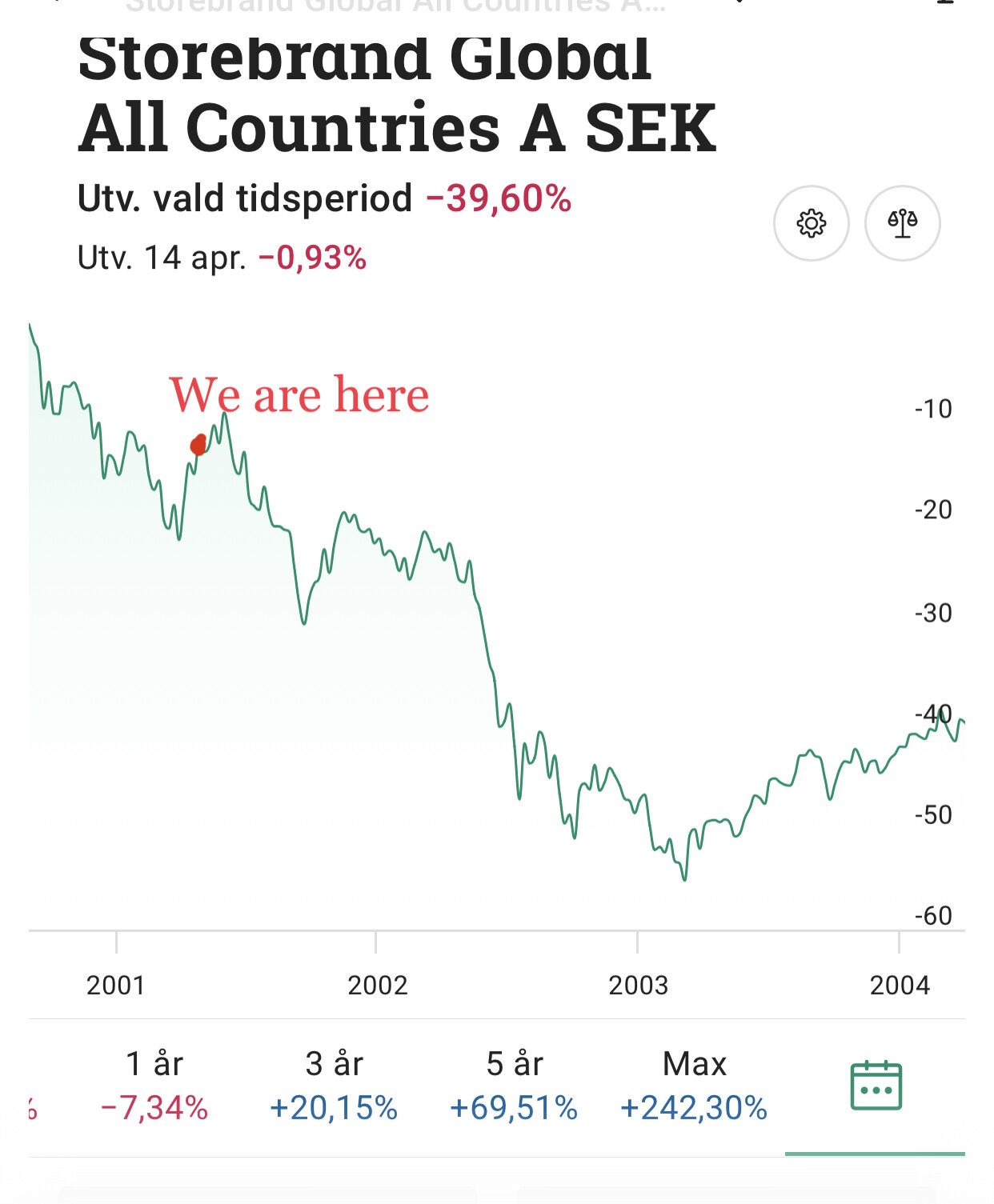 Men om min fond som nu gått mycket minus eftersom jag köpte fond för första gången i början av året, om det nu blir dåliga år om mina 200 000 är tillbaka på 200 000 först om 5 år eller mer, då hade jag ju haft mer pengar om de legat på bankkonto med ränta, eftersom dom pengarna hade växt under tiden om än långsamt?