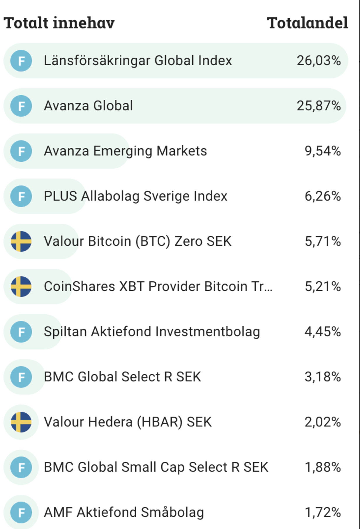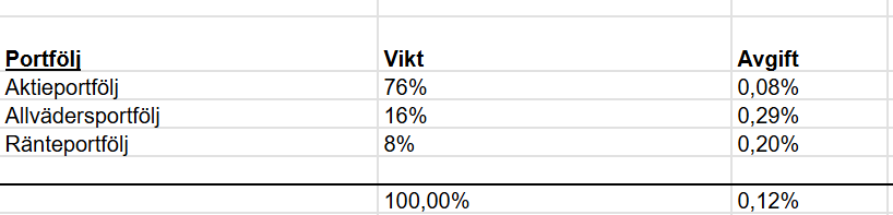 - ca 10% aktiefonder (ett par “globalfonder”: 95/75/55 respektive för exponering mot USA, ett par investmentindexfonder och ngn Sverige-fond)