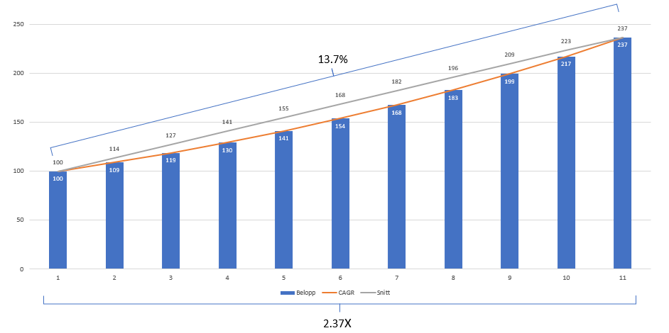 CAGR är ränta på ränta (staplarna och trenden som följer staplarna).