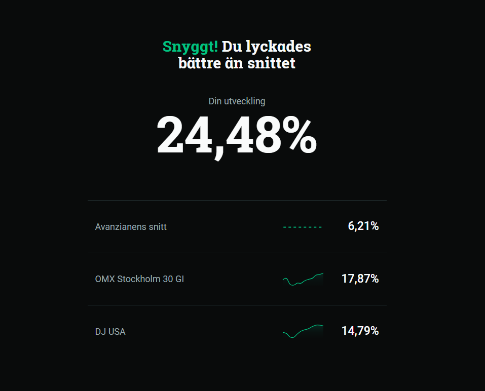 Då var den här. Avanzas årssammanställning som man kan jämföra - även om det är typ två veckor till årsskiftet. Så det är bara att dela med sig, hur gick det? Blir det bubbel eller gravöl?