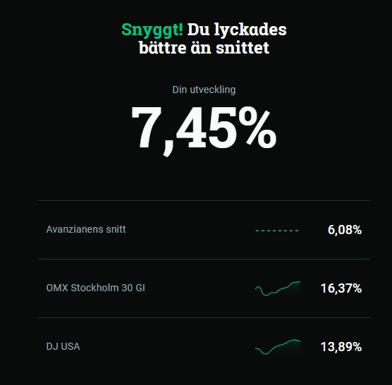Ganska nöjd då jag har stor andel räntor på grund av att min “mellanriskportfölj” är placerad på Avanza.
