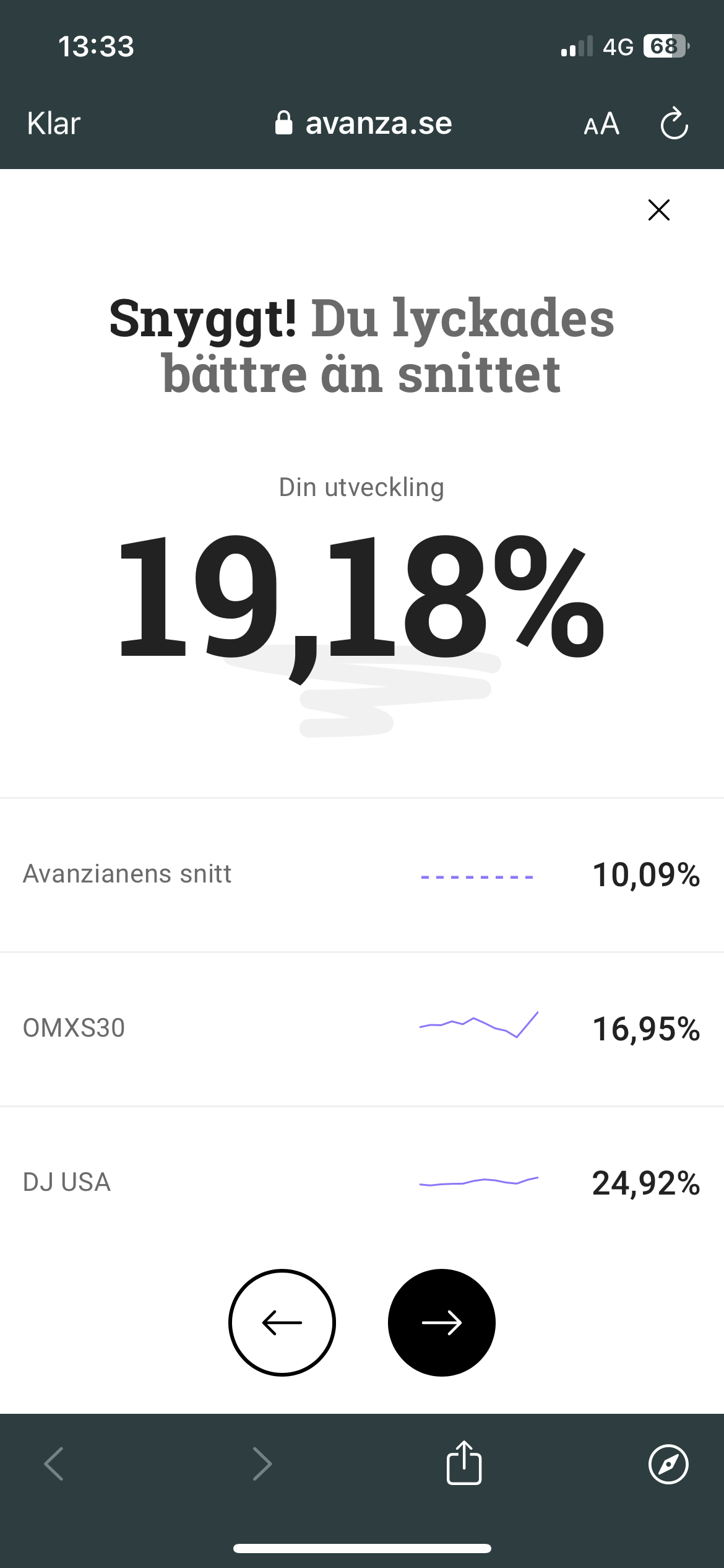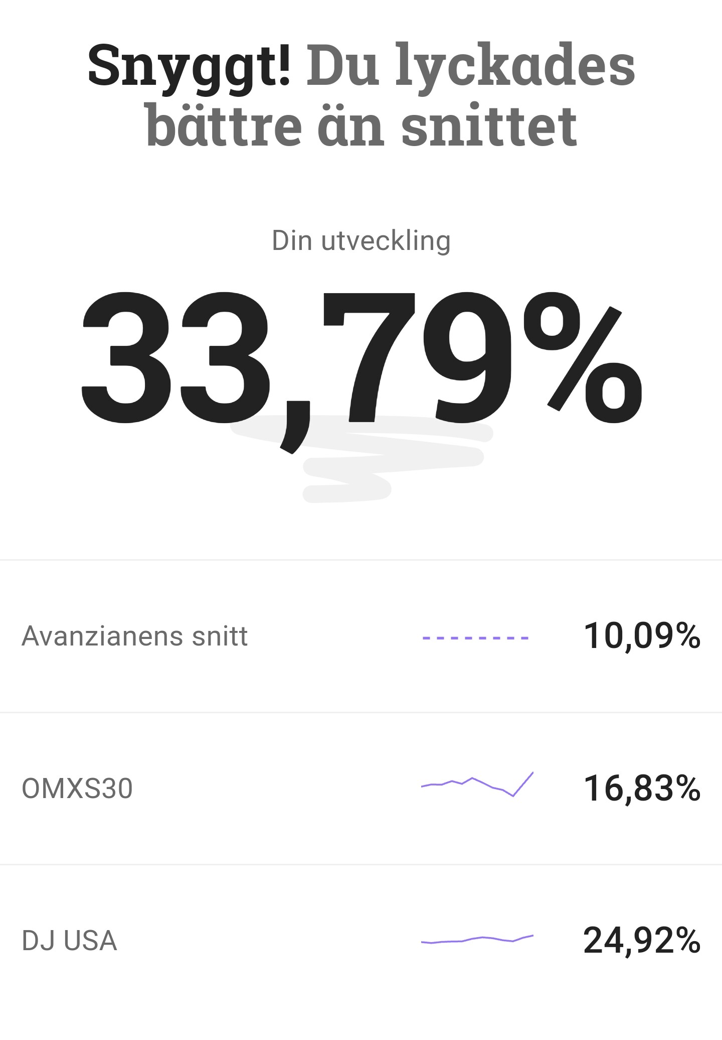 Äger bara indexfonder, anledningen till varför att det gått upp så mycket är för att jag tog lite risk och bytte ut en stor del global mot Sverige när dollarn stod högt och det har betalat av sig.