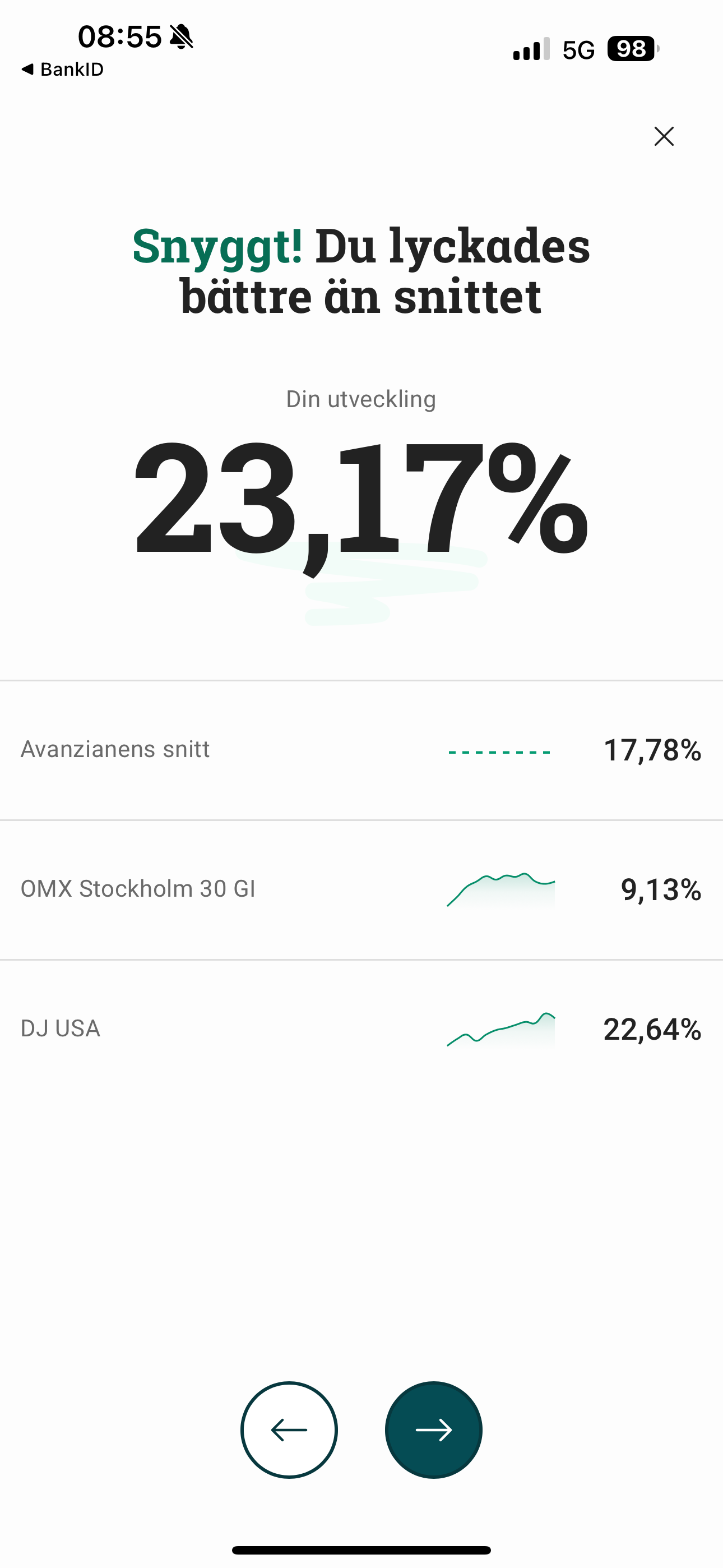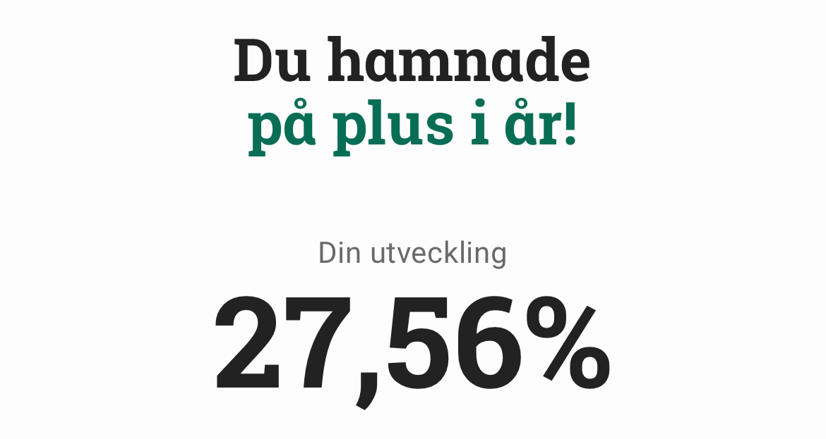 Men jag har fått 33.28% i avkastning totalt hos mina indexfonder, Lysa hållbar och min KF fram tills idag. Så är helt klart nöjd. ![]()