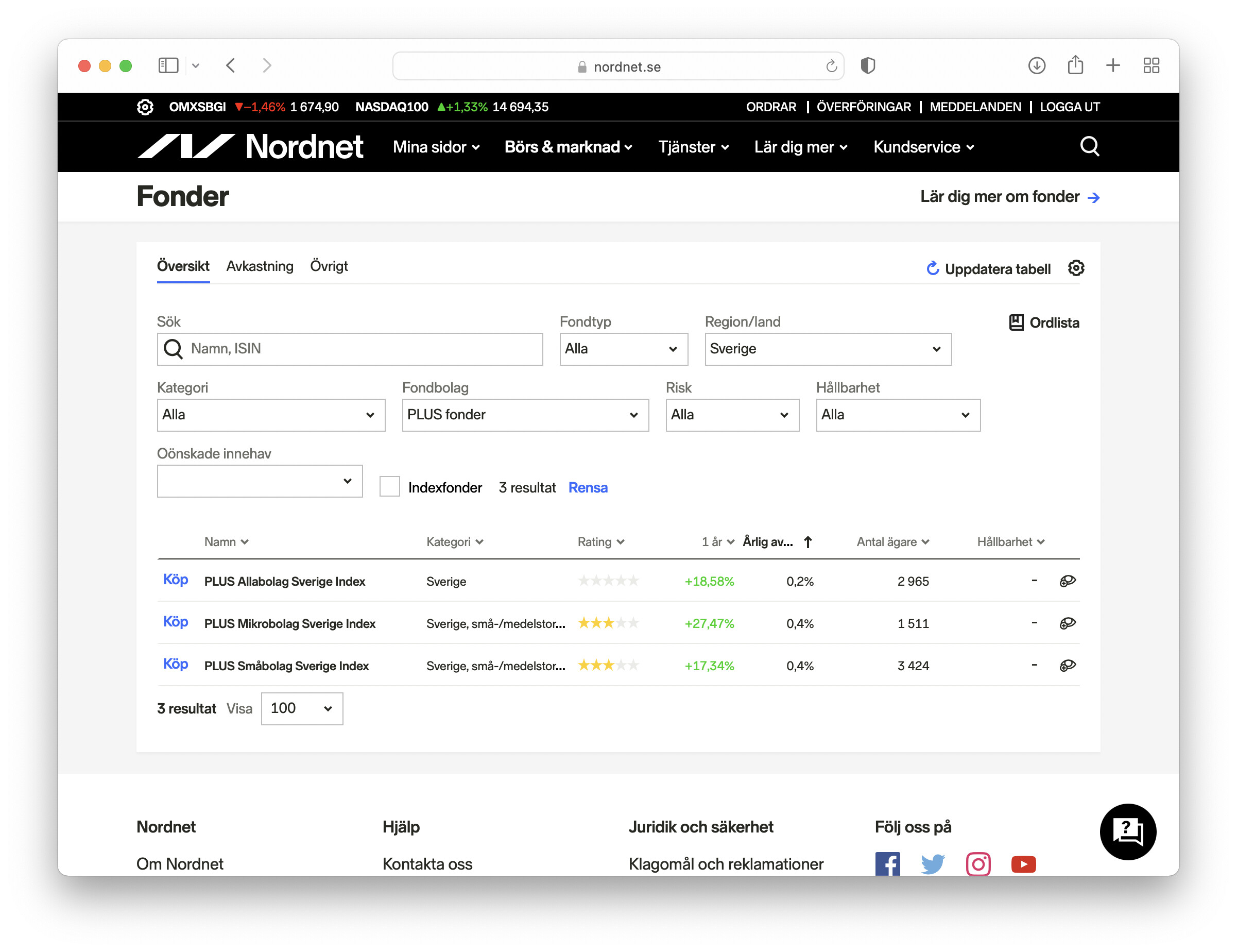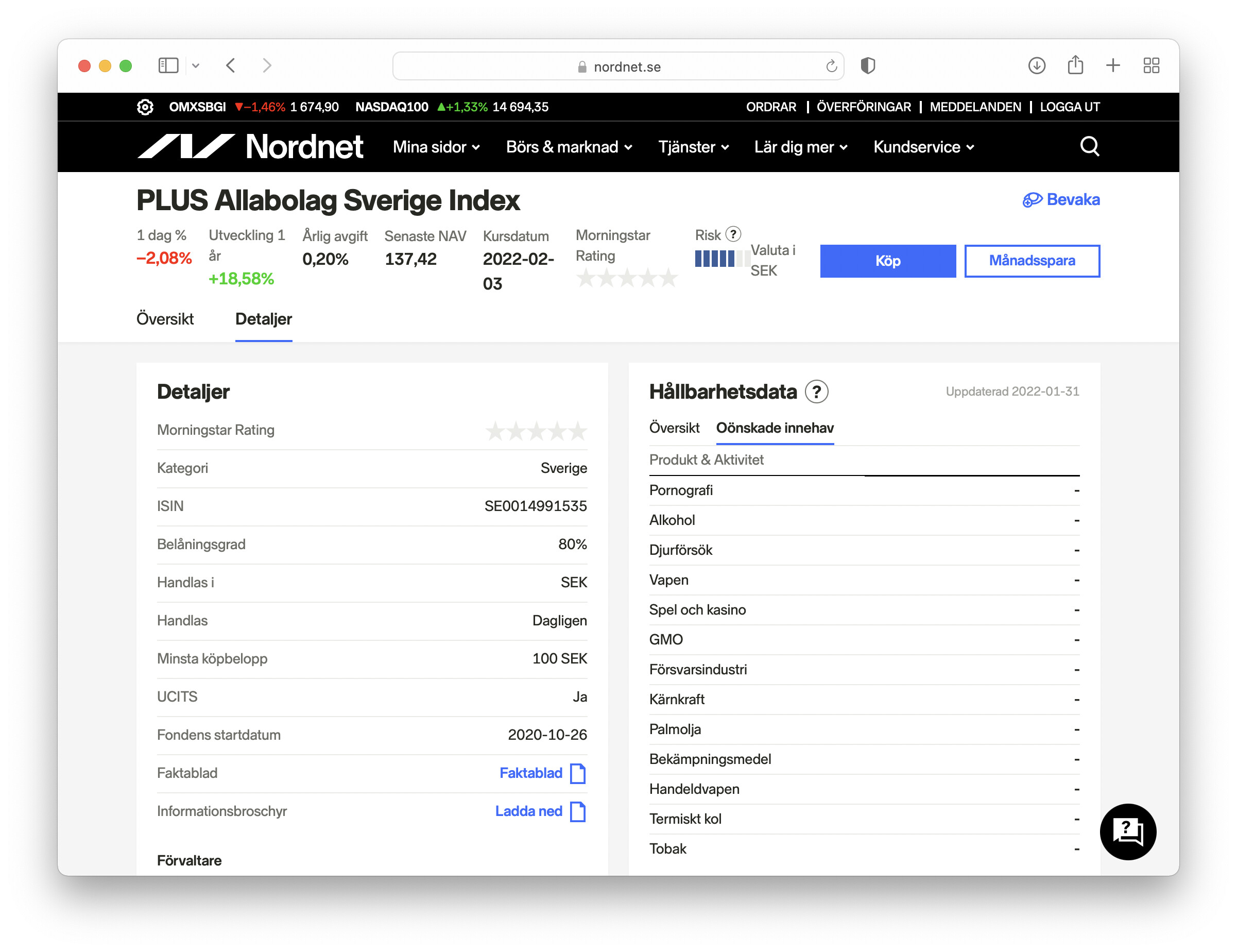 Av nån konstig anledning verkar Nordnets hållbarhetsredovisning fungera mycket bättre när marknaden är öppen. T.ex. så här står det just nu för Plus AllaBolag Sverige: