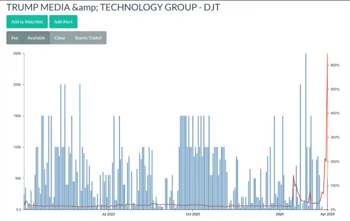 - As mentioned in our last piece, the insider game of yanking blocks of shares out of the borrow pool is well known by the pros. This drives up the borrow fee even higher, and can cause dreaded “buy-ins”, involuntary purchases made by brokerages to cover their customers’ short positions if there aren’t shares to borrow. If DJT sees future violent price rises unexpectedly, this is probably the reason.