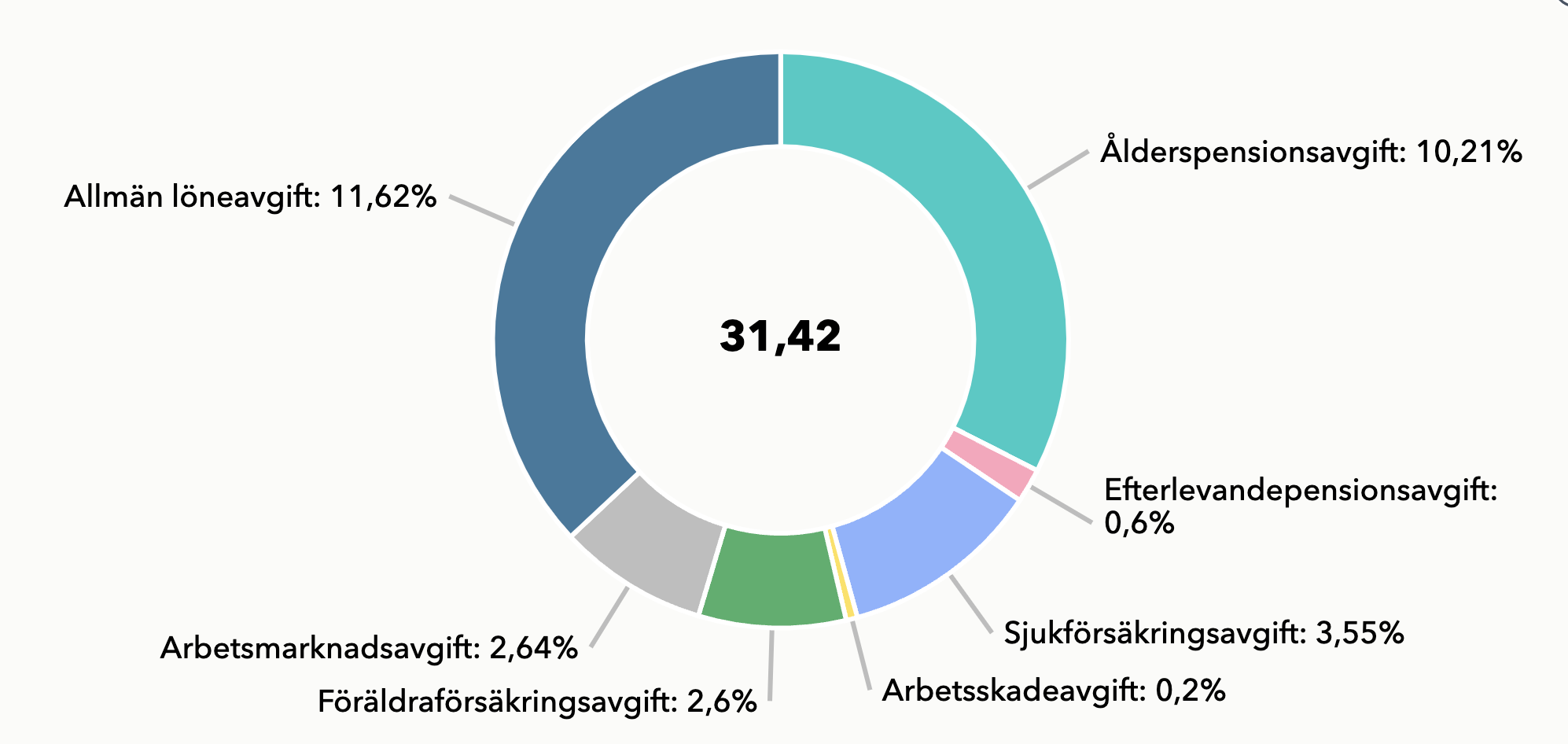 Det som återstår efter att arbetsgivaravgiften reduceras till 10,21% är ålderspensionsavgiften där man fortsätter att tjäna in pensionsrätter. Här är ett stiligt diagram från Ekonomifakta som ger en inblick av vad exakt det är man skalar av.