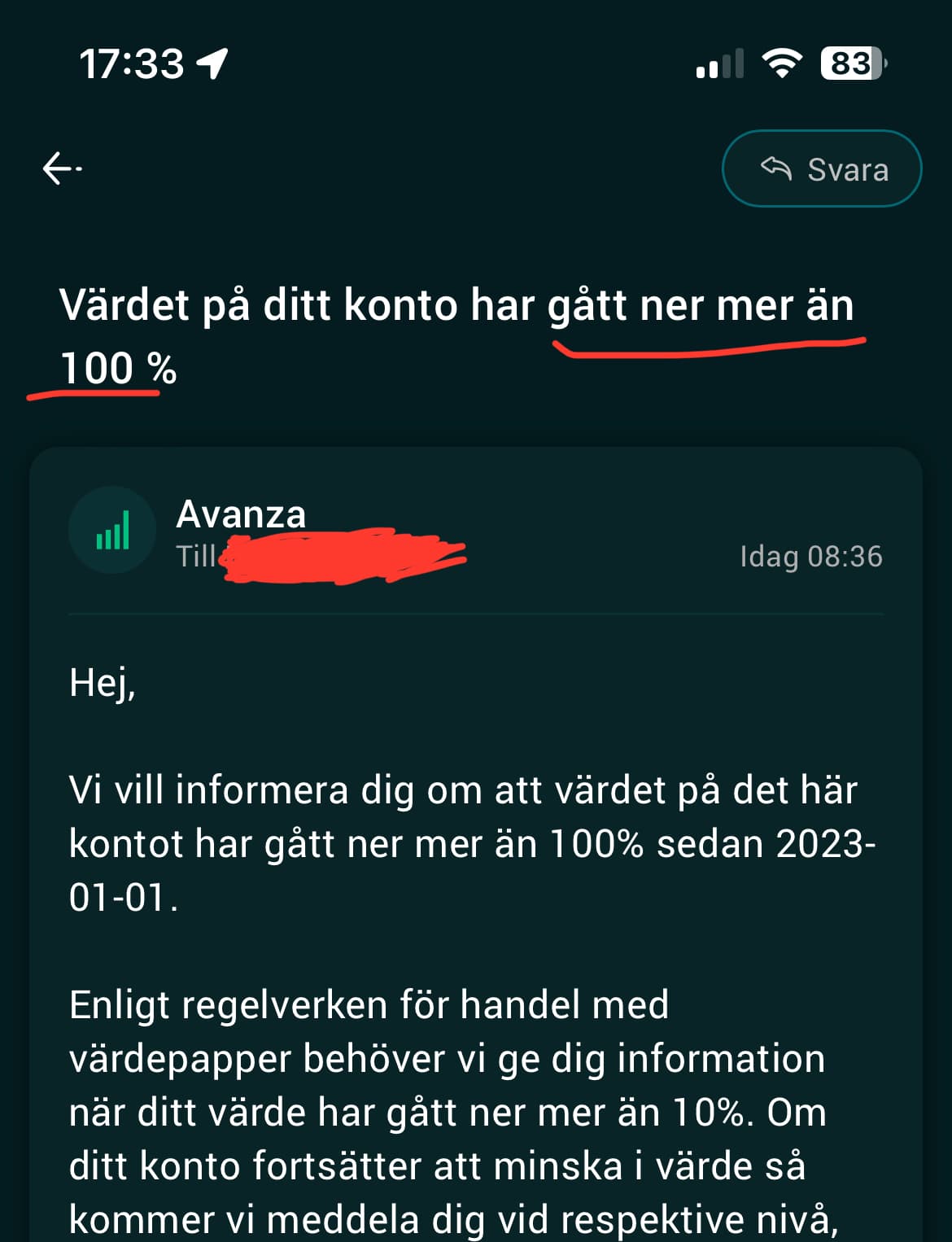 Känslan i magen när du får detta meddelande, på ett konto som har upp till 750 000kr i kredit på.