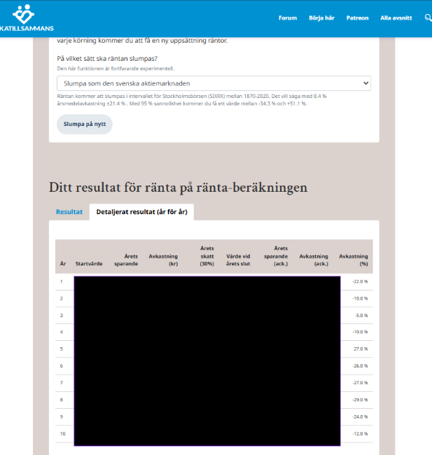 Jag testade precis att simulera 15 år framåt med slumpränta, där jag började med min nuvarande investerade summa och lade in 10k per månad. 1/4 av gångerna förlorade jag pengar på att ha dem investerade, även på 15 års sikt!