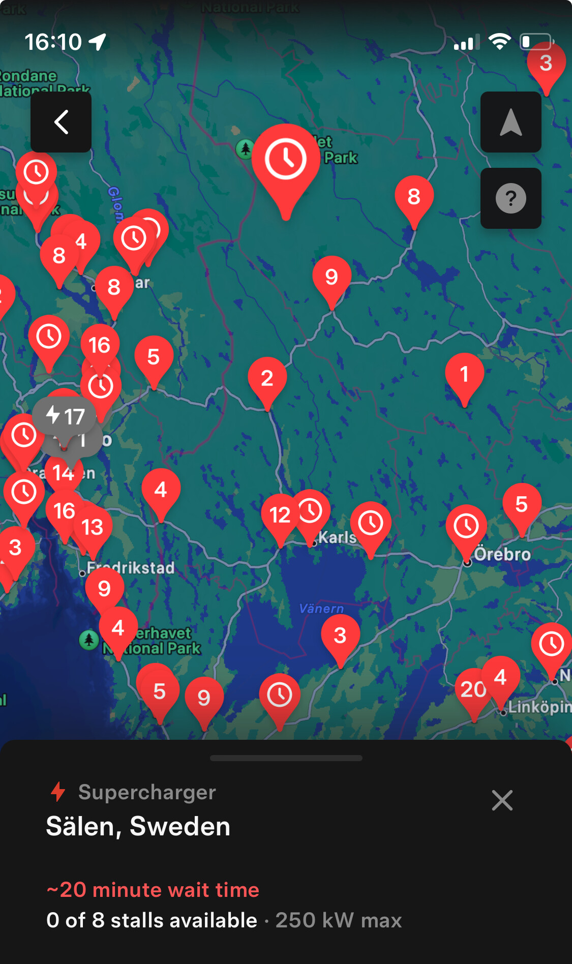 ChargeFinder ger ju en ögonblicksbild över hur upptaget det är, ser ok ut just nu men jag kommer se till att lägga de kritiska stoppen på platser där det antingen finns en större Supercharger eller flera alternativ. Att stanna i nån mindre håla med 1-2 150kW från nåt obskyrt nätverk gör inte jag…