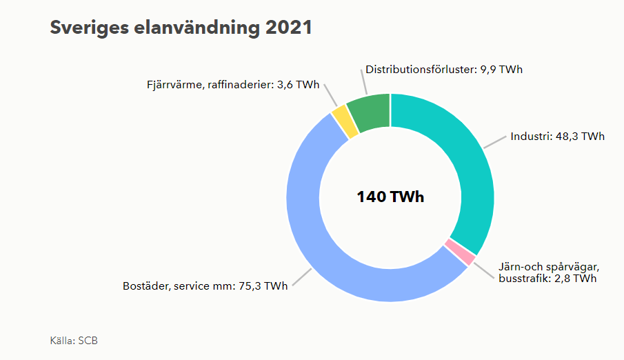 Enligt en prognos från Energiföretagen kan elanvändningen år 2045 uppgå till 310 TWh vilket motsvarar en ökning av dagens konsumtion med 120% och är nästan dubbelt så mycket som dagens elproduktion i Sverige klarar av att ge. Detta beror till stor del på stora energikrävande gröna industrisatsningar med vätgas som bas. T.ex. beräknas HYBRIT-projektet (SSAB+LKAB) att kräva ca 55 TWh el per år när produktionen är fullt utvecklad.