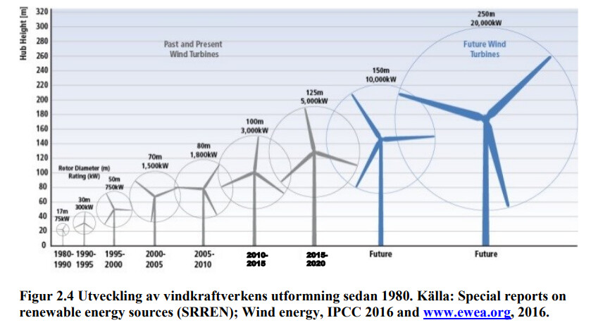 Enligt Energimyndigheten blir vindkraftverken effektivare med högre torn och större rotordiameter då detta leder till högre vindhastigheter och större svepyta.