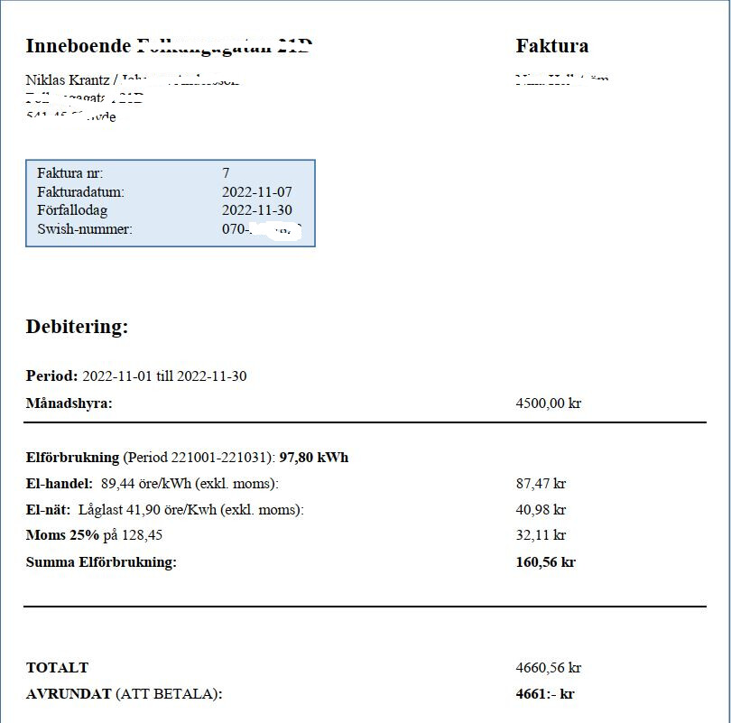 Så här ser en typisk faktura ut för min uthyrningsdel i källaren.