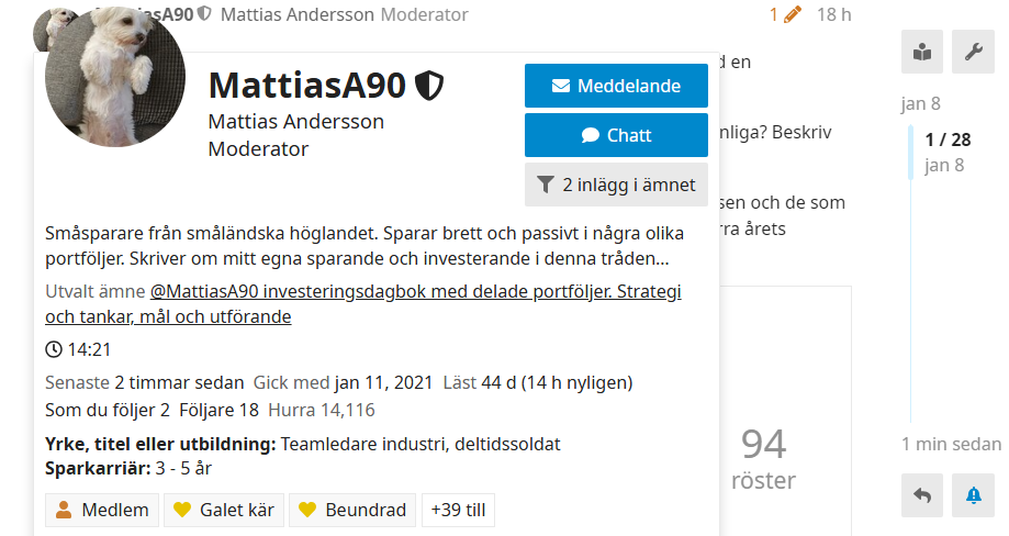 Sparkarriär och en kort beskrivning om en själv och sin investeringsfilosofi går ju att lägga till i sin profil, så att det syns när någon tryker på din profilbild. Likt nedan när man trycker på min profilbild.