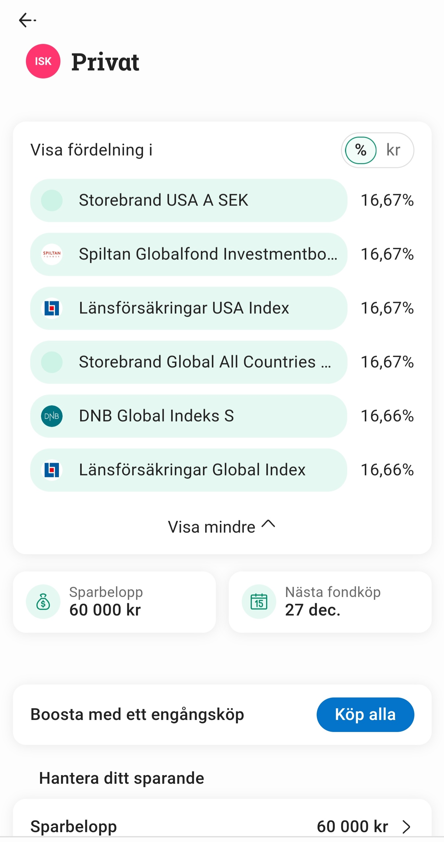 Jag instämmer med föregående skribenter om att du bör skära ner på antalet globalfonder. Det jag saknar i bilden är en Sverigefond eller ett par svenska investmentbolag. Det kanske du har någon annanstans?