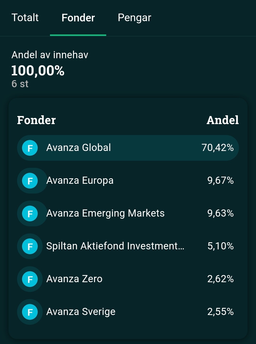 Valt att ha lite extra i Europa och Sverige, därav antalet fonder. Snittavgift 0,13%.