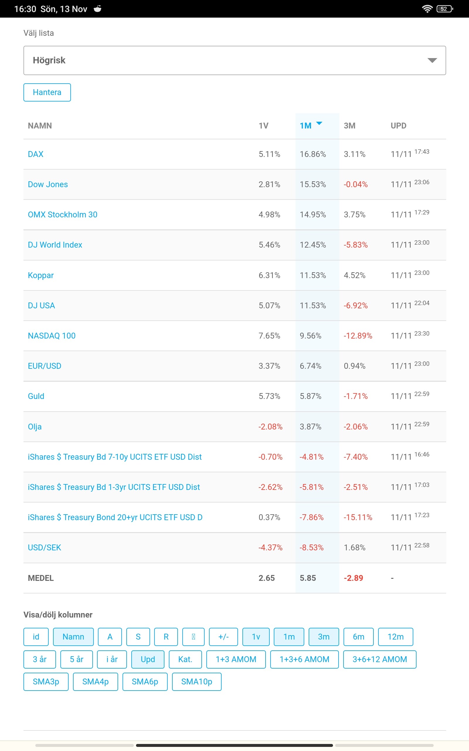 “Högrisk-MOM” med byten varje vecka och en lookback om 1 månad, ovan visar dess ytterst begränsade universum. “Högrisk” då portföljen använder hävstänger vid handeln.