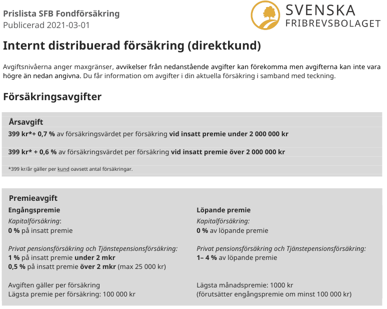 Så på en kapitalförsäkring blir det 0,7% och 399 kr per år. På en tjänstepension har de samma avgift plus en insättningsavgift på 1-4%. Det verkar bli väldigt mycket dyrare att flytta tjänstepensionen till Svenska Fribrevsbolaget än att flytta den till Avanza. Det är väl därför de inte har den här prislistan speciellt lättillgängligt.