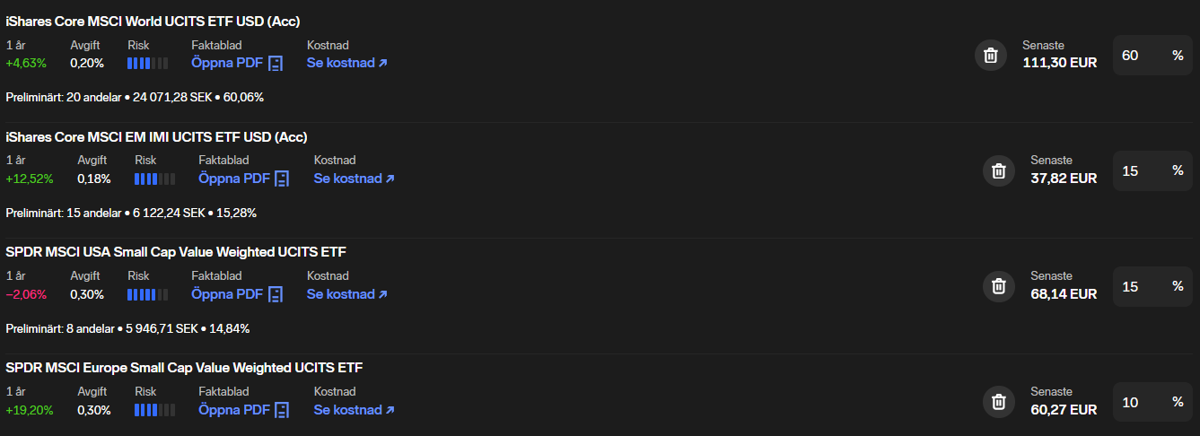 Jag försöker få ihop ett månadssparande i ETFer som bygger på forskning. Se upplägg nedan. Kommentarer? Fundera på att lägga till 5-10% quality faktor (IS3Q) också. Något som är mer insatt i forskningen än jag?