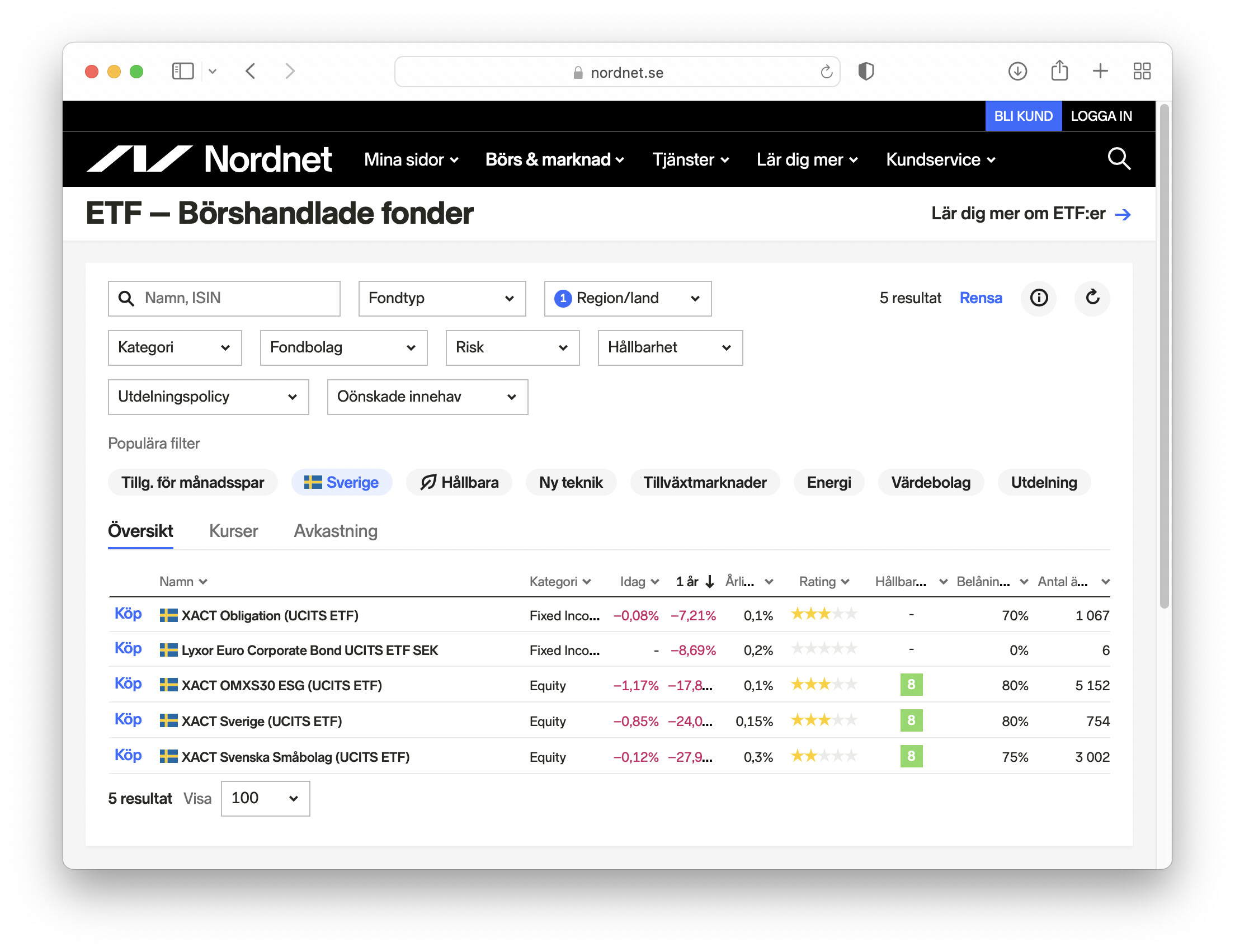 2 som följer räntemarknaden, 3 som följer aktiemarknaden. OMX30 går bort för att den bara följer 30 bolag samt att den är ESG. De andra två skulle teoretiskt kunna kombineras för att få en hyfsat bred Sverigeexponering, men går bort eftersom de också är ESG (följer SIX Sweden ESG Selection Index GI och Solactive ISS ESG Screened Sweden Small Cap Tradable Index).