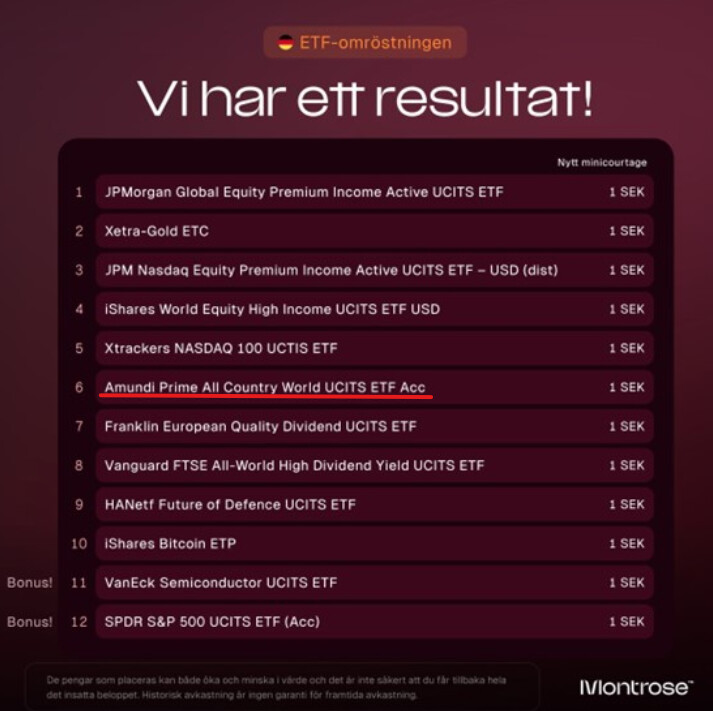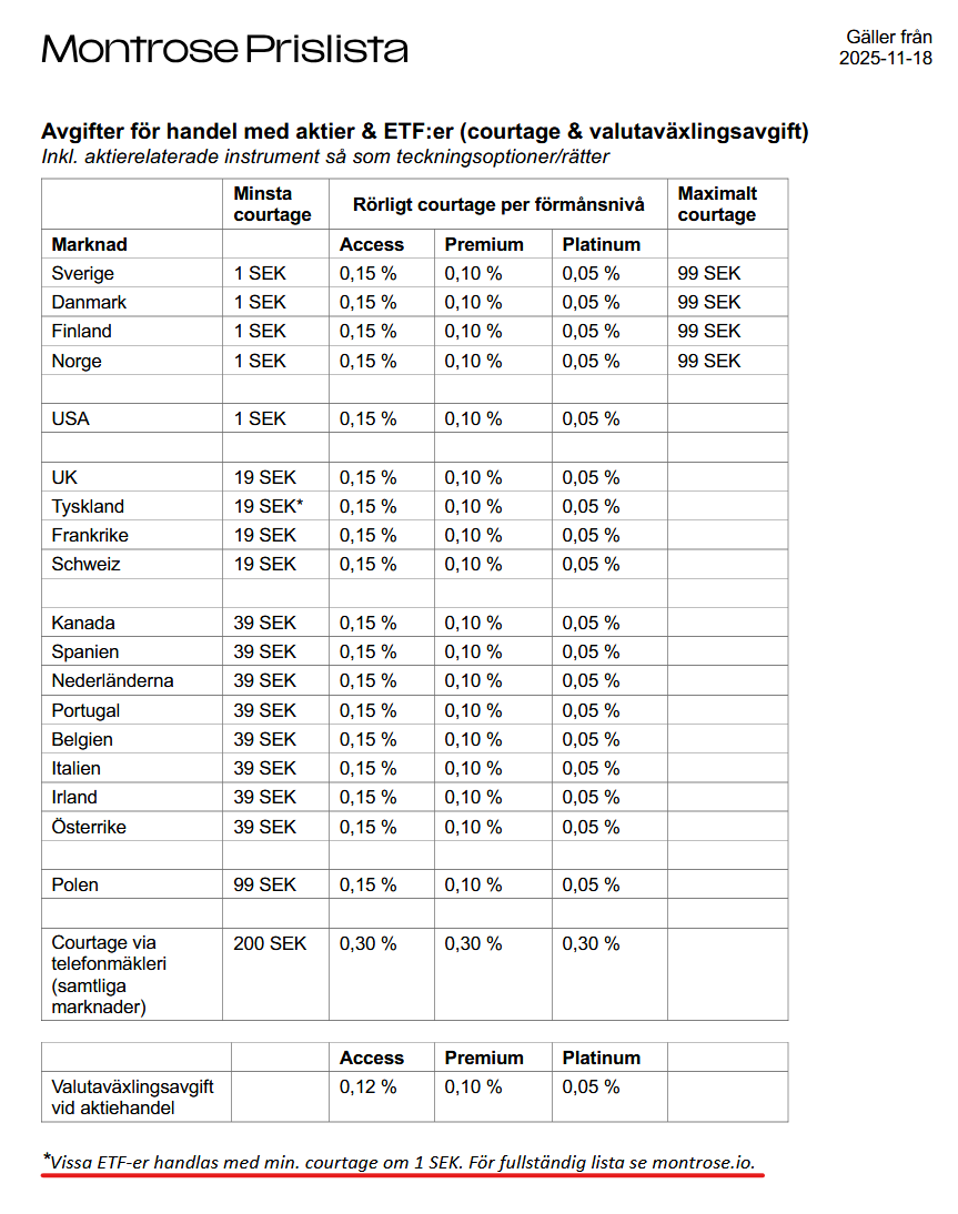 Dessutom handlar man den courtagefritt också. Är man ute efter en global ETF så är denna faktiskt grym. SAVR har dessutom courtagefritt för iShares och Virtune ETF:er. Kommer inte ihåg ifall det fanns fler. Montrose är bra när man handlar USA/SWE men mindre bra för ETF:er på tyska börsen då min courtage är 19kr (såvida man inte handlar för 10k eller mer om jag minns rätt).