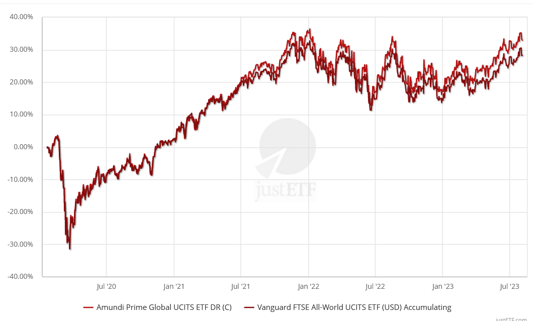 Jag kikade också på Vanguard All World, men kom fram till att den har för hög avgift (0.22%) för att vara en ren index-fond. Valde istället Amundi varianten som använder ett annat, lite nyare, all-world developed index (Solactive GBS Developed Markets Large & Mid Cap index). Amundi fonden är riktigt billig (0.05) och har runt 1500 aktier. Jämför man dessa fonder så ser de väldigt lika ut så långt tillbaka man kan jämföra: