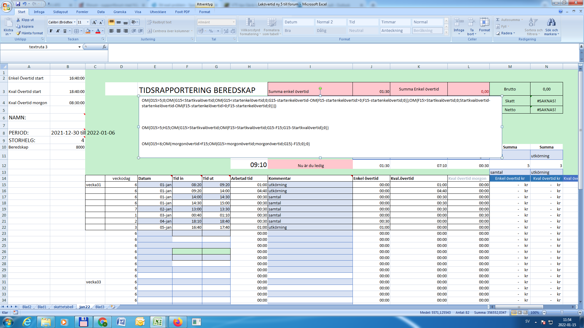 hej på er alla jag önskar hjälp med min exelfil thomas här på forumet har hjälpt mig tidigare det gäller uträkning av tid för enkelövertid plus kval övertid problem uppstår när röd dag är på en vardag då är det kval övertid som det är nu så tror exel att det är en vardag och då får jag enkel övertid