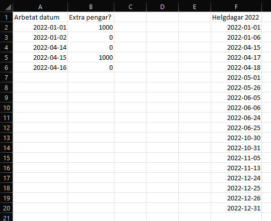 problemet lyder så här i kolumn b2 har vi alla storhelger i c2 där skriver jag det datum jag jobbar för en hel vecka då vill jag att i d-kolumnen känner av om jag jobbar storhelg och lägger dit 1000 kr på den rad som är en storhelg