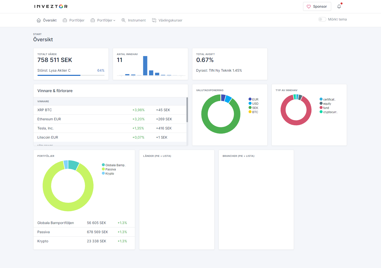 Se värde, valutor, avgifter, avkastning, sektorer, länder, både totalt och per portfölj