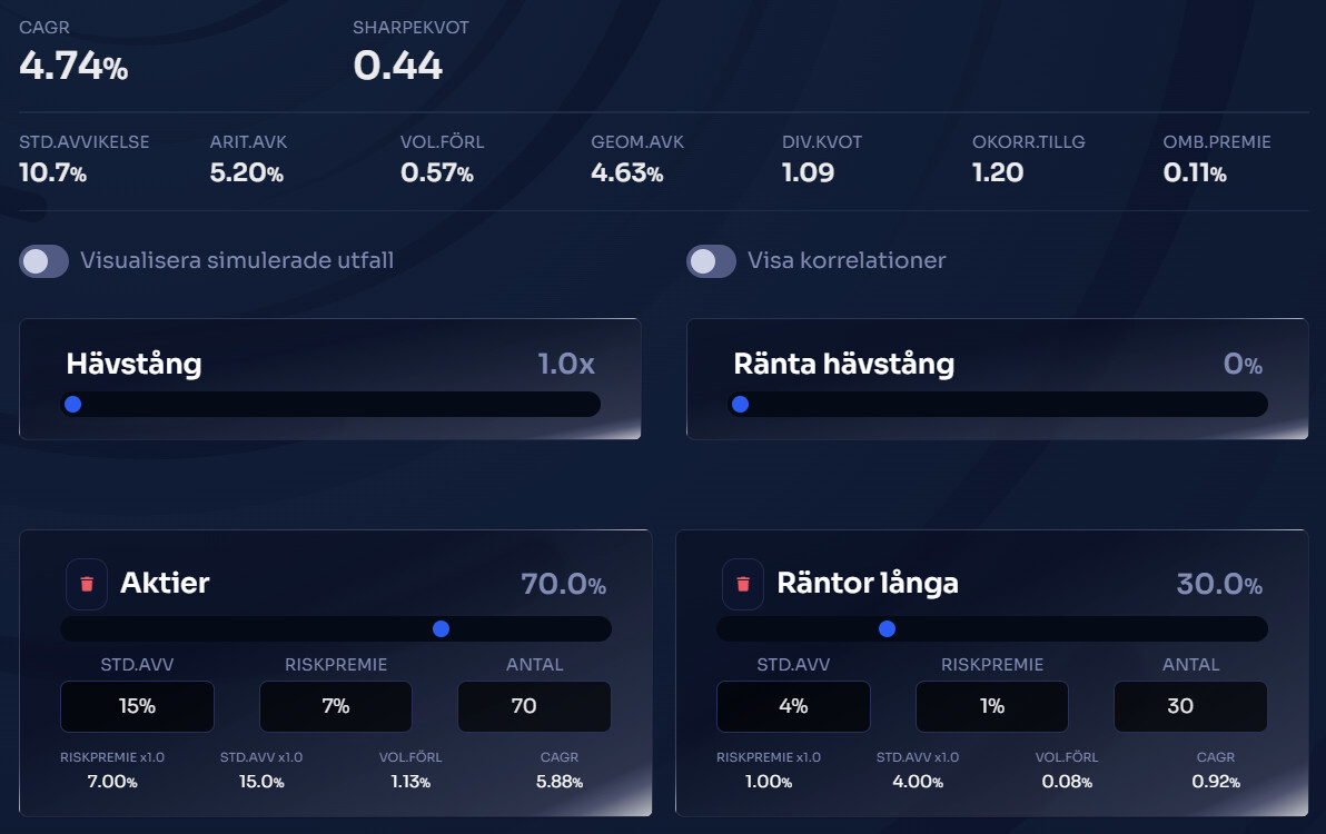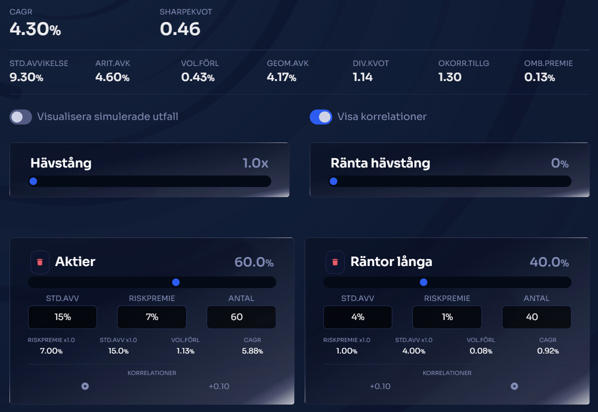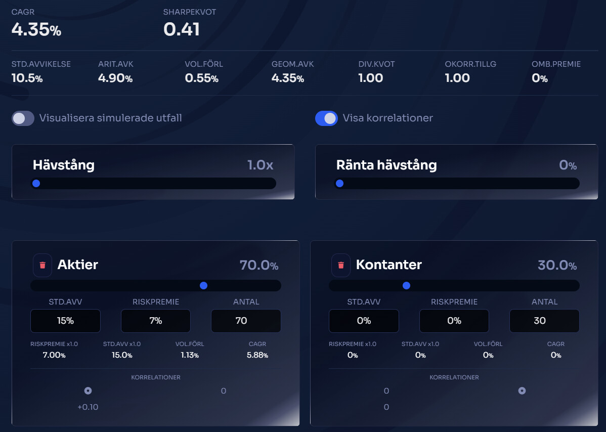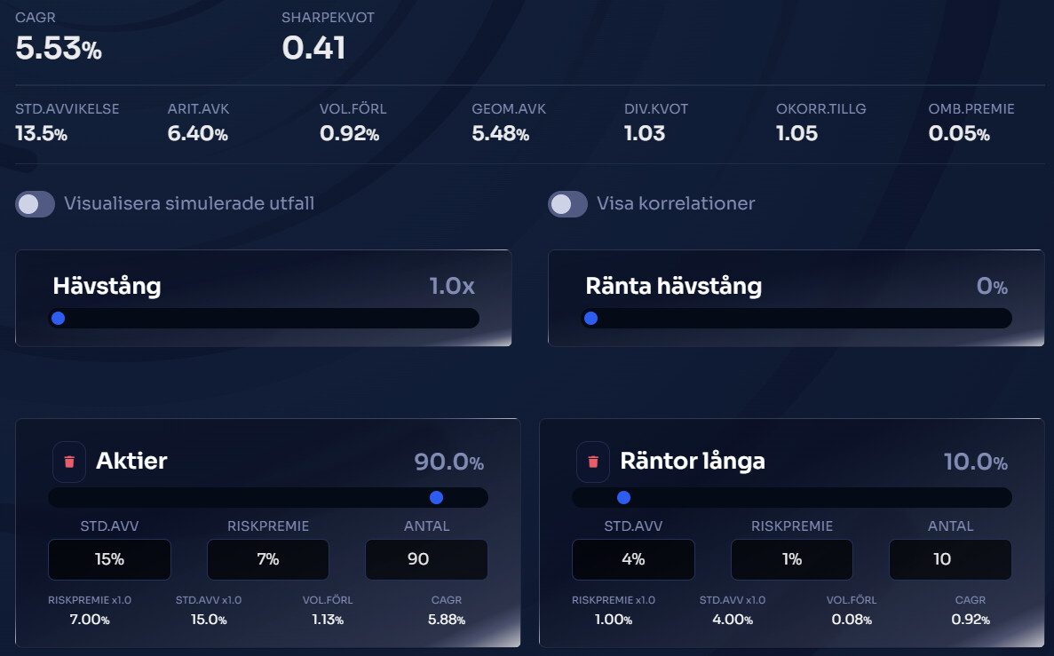 Avkastningen för räntor ser jag inte i dina beräkningar? Jag antar 0.88% just nu (1%-0.12% avgift). Antar att din standardavvikelse kommer dra ner avkastningen här också? Att räkna med en given korrelation här introducerar ännu en osäkerhetsfaktor men en korrelation på 0.1 är väl ändå en högre korrelation mot aktier än bankkonto har?