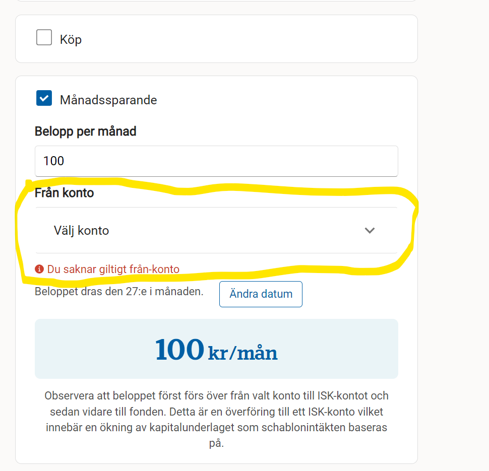 Du kan bara välja det alternativet på en dator. Går inte på iPad eller mobiltelefon. Dessutom måste du redan ha genomfört ett köp av den externa fonden innan du kan skapa ett månadssparande.