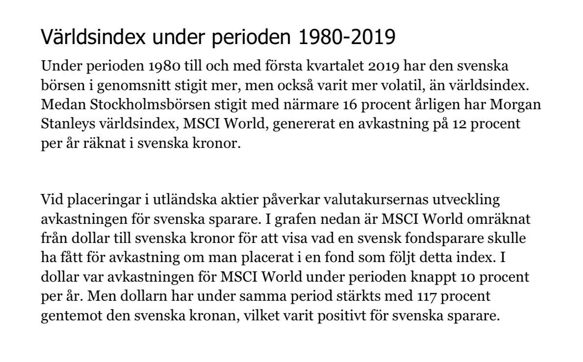 Men du höjer risken om du ökar Sverige i aktiedelen . Du jagar mer avkastning marknadstajmning med andra ord . Det är smart att avvika i från global index om man vet att Sverige kommer ge mer även i framtiden . Men då får man ha 50% Sverige för att överavkastningen ska märkas. Räcker inte med 10-20% . Du vet själv att val av olika lands index påvärkar inte så stort avkastningen. Det är aktiedelen i % som är ändå avgörande. . Även om du väljer 30% breda Sveriges index känns det riktigt bra