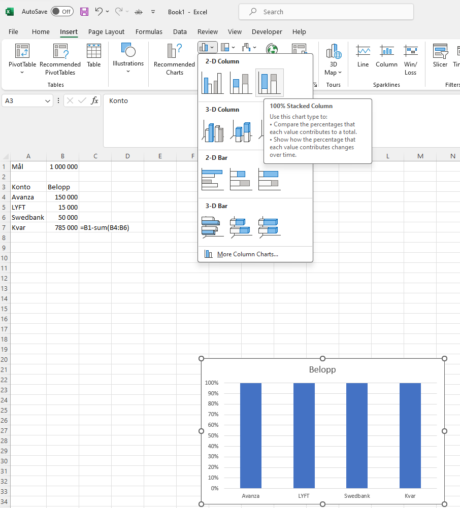 finns det någon smart funktion i Excel (som ni kanske använder) där man följa hur långt man nått mot målet? Exempelvis en pie chart eller linjediagram där 100% innebär miljonen och jag är uppe i t.ex 210.000 kronor (21% ifylld av figuren etc.). Ingen jätteviktig detalj för ekonomin, mest skönt att på ett enkelt sätt se hur långt man har nått.