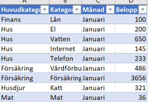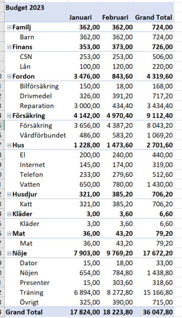 Pivottabell med grupperingar för olika kategorier.