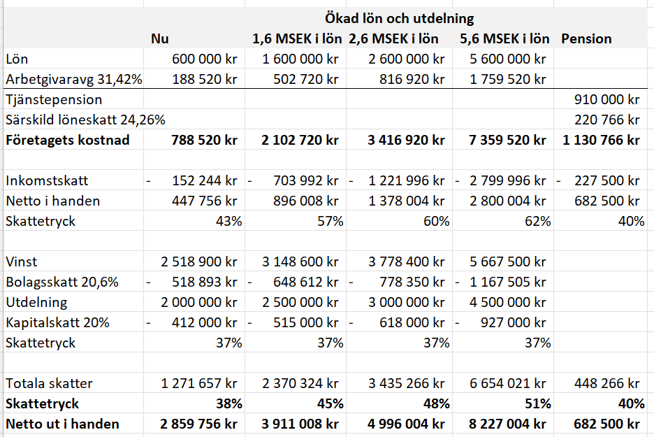 Säg att jag istället för 600 tkr i årslön tar 2 miljoner extra, dvs totalt 2 600 000 kr i årslön. Då blir den genomsnittliga skatten på lönen runt 50%.
