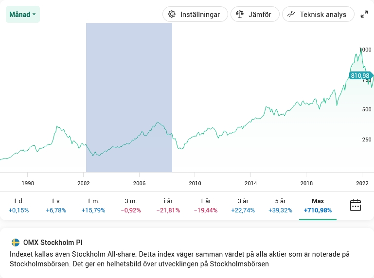 så har man gått miste om stora uppgångar. Men många techjättars fall har raderat ut 6 år av uppgångar redan i år. Men det har inte varit svårt att se att många FAANG aktier sett väldigt dyra ut efter att ha gått upp många hundra procent per år under många år, med skyhöga PE tal. Tajming är nog svårt men man kan se när det är dyrt och när det är billigt. T.o.m. Jan säger att det är billigt nu, och om man någon gång skall börja månadsspara så är det nu. Är inte det ett uttryck för marknadstajmning? Kanske är det lättare att se att det är billigt efter att en aktie rasat 75% än efter att den gått upp 75% ?