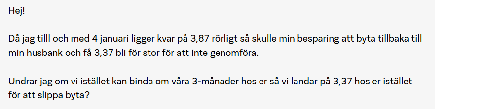 Läste ett inlägg på Threads att en kille kontaktat sin bank och “krävt” att de skulle sänka hans rörliga (3-månaders) ränta med 0,5% med anledning av senaste riksbankssänkningen.