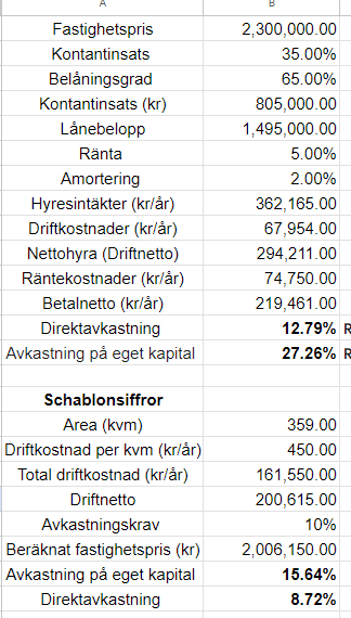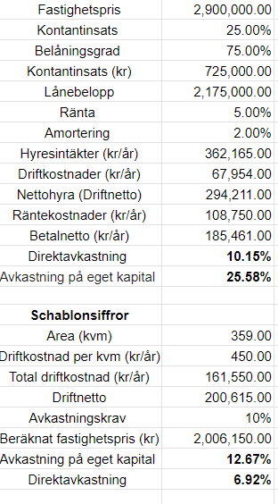 Vid 700tot kostnad/kvm blir det 251300kr om året i kostn och lite andra % på avkastning som känns mer bekanta vilket brukar va runt 4% obelånat. Däremot tycker jag man på plussidan kan räkna med 2-3% inflation ovanpå dom tex 4 procenten eftersom det på sikt äter upp lånedelen och hyrorna bör följa med upp. På riktigt lång sikt bör det ge bätte och bätte avkastning i förhållande till ditt initialt investerade belopp.