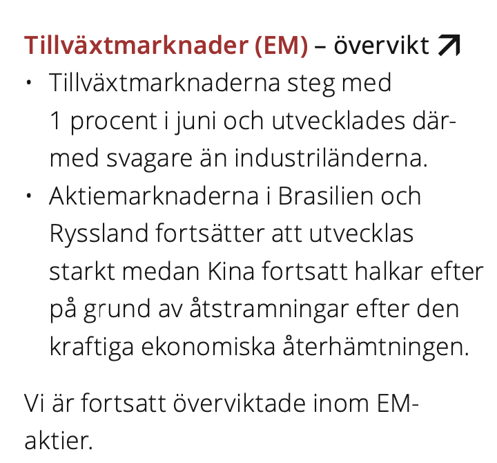 Om man ska övervikta/marknadsvikta/undervikta EM diskuteras det mycket om. Låga värderingar, länder som växer mycket, men mycket politisk risk. Finns hur mycket info som helst från alla möjliga institutioner. Men om du vill övervikta kan du t.ex. ta rygg på SPP som överviktar EM. https://www.spp.se/globalassets/dokument/marknadsrapporter/spp-marknadsrapport-juli-2021.pdf