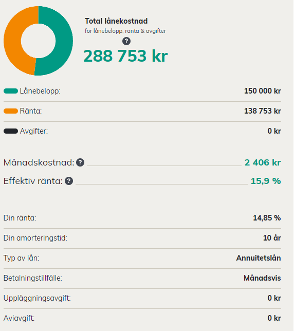 Kan inte se någon “effektiv ränta” på websidan, bara “Nominell ränta” har ingen aning om det är samma, men den ligger på 14.85%