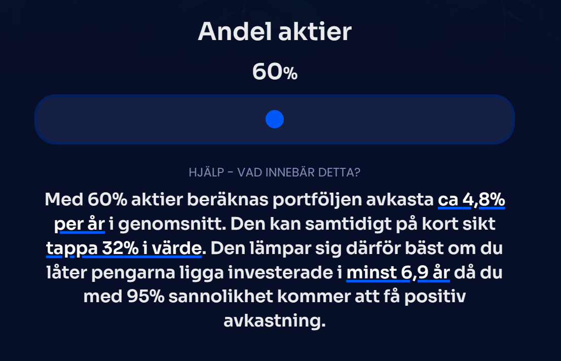 Då raka frågor om tidshorisont och drawdown/risktolerans kan vara svårt att svara på så labbar jag med en annan approach. Att helt enkelt försöka förklara med ord vad en viss andel aktier innebär (baserat på statistik/historik).