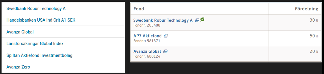 Så 80% AP7 Aktiefond och 20% Storebrand Sverige kan vara ett alternativt.