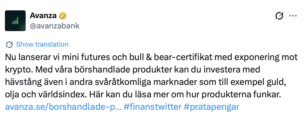 Avanza gör reklam för crypto bull certifikat, vilket är långt mycket värre än en indexfond för 1.5%