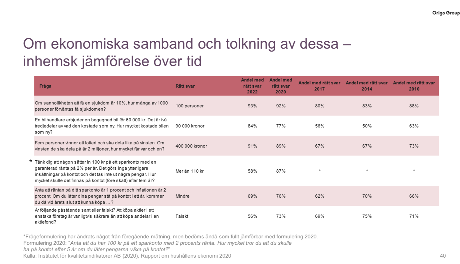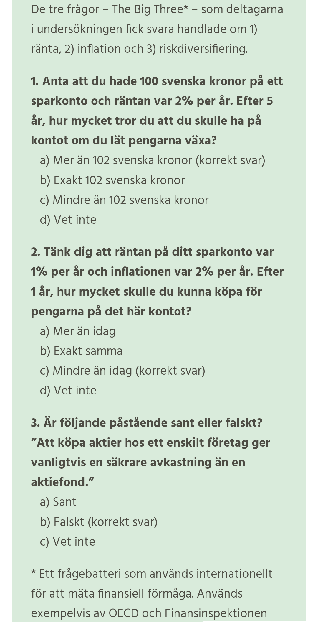 I en ny studie med unga svenska vuxna (18 - 29 år) återfinns tre av frågorna från Finansinspektionens undersökning (trådens första inlägg) om grundläggande ekonomi. 2050 unga vuxna fick bland annat tre snabba frågor med tema inflation, ränta och riskdiversifiering: