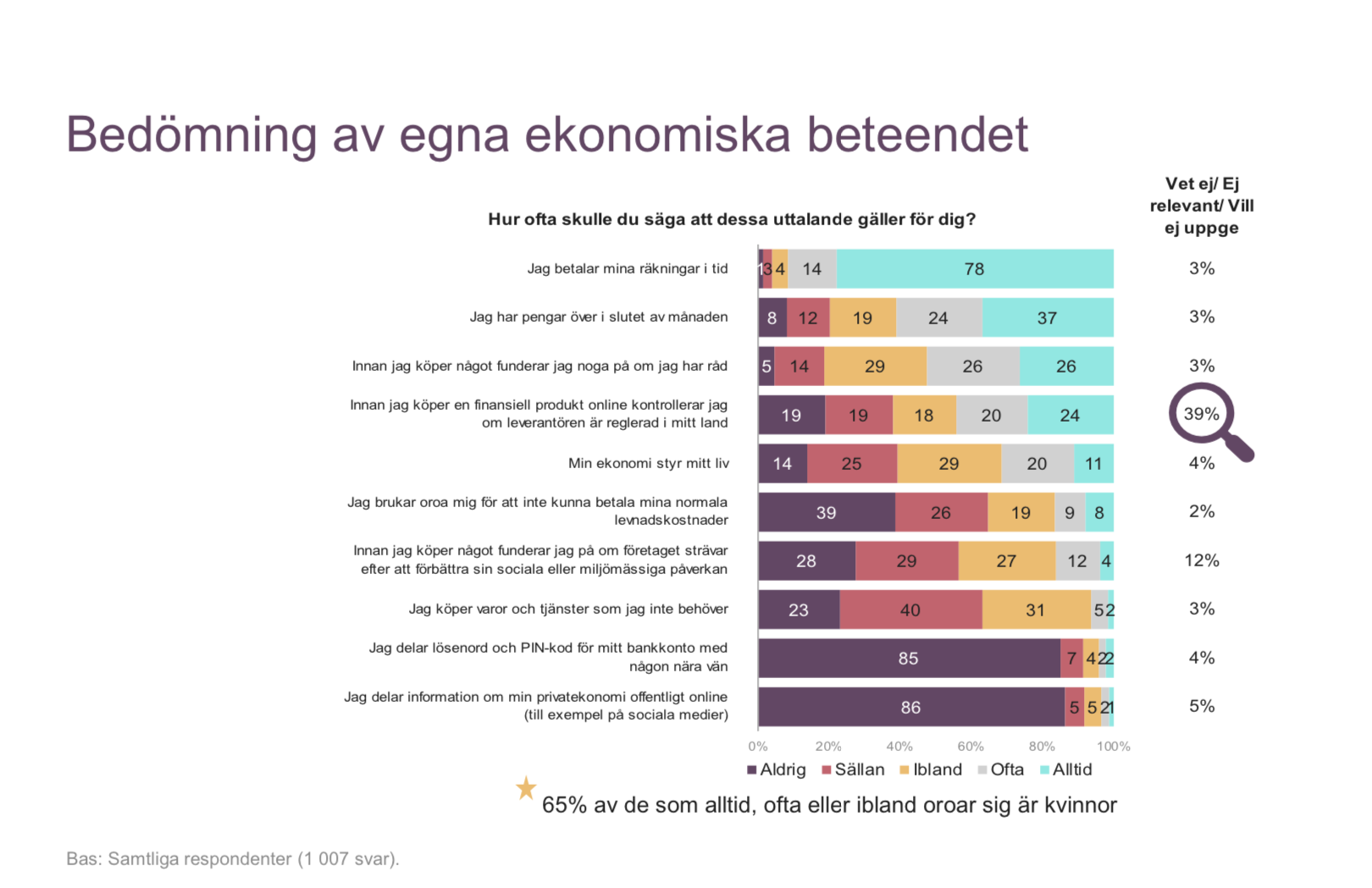 Däremot har självförtroendet att förstå ekonomi ökat. Särskilt män uppger att de har högt finansiellt självförtroende och kunskap medan kvinnor och personer under 30 år uppger att de har lägre självförtroende och kunskap.