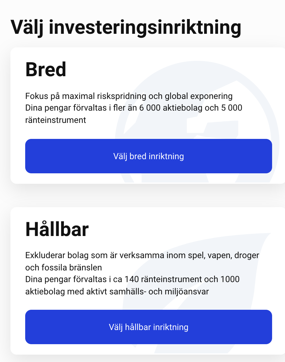 Självklart ingår det oetiska bolag (spel, vapen, droger och fossilabränslen) när man väljer den Breda alternativet.