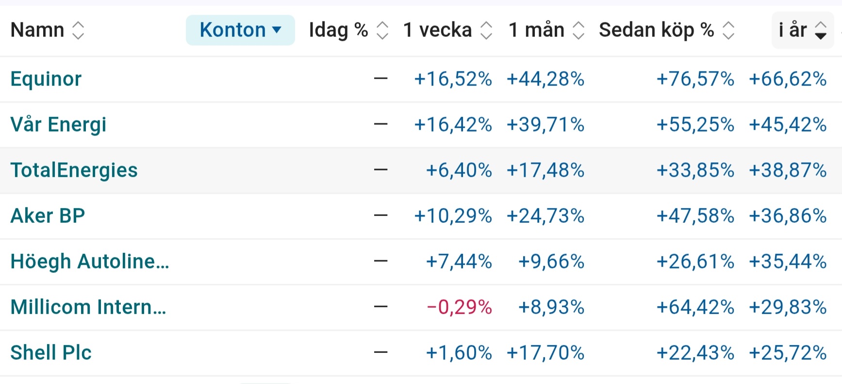 Alltså jag utvärderar inte portföljer på daglig basis. 2,3 % upp i år och drygt 11 % på ett år. Tror att råvaror är det som gått bäst på sista veckorna. Men jag ser portföljen som en helhet och utvärderar dess prestanda på helhetsnivå enbart.