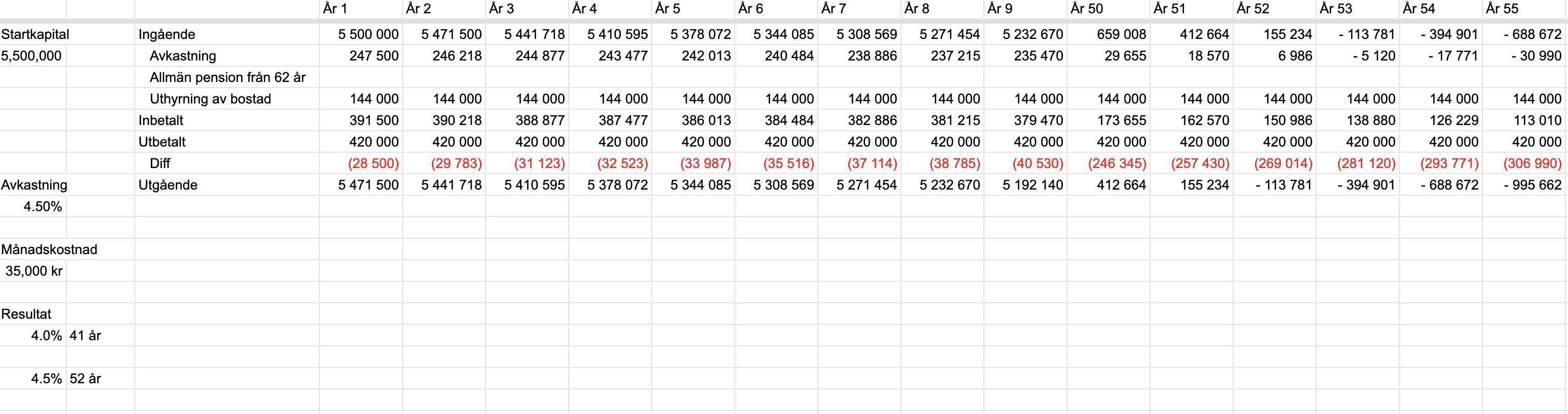 I ditt fall räknar du på ett uttag med 35 000 kr/mån = 420 000 kr/år. Du behöver då 420 000 / 0,04 = 10 500 000 kr i kapital. Dina 5 500 000 kr som du har nu räcker till ett uttag på 5 500 000 x 0,04 = 220 000 kr/år eller 18 333 kr/mån.